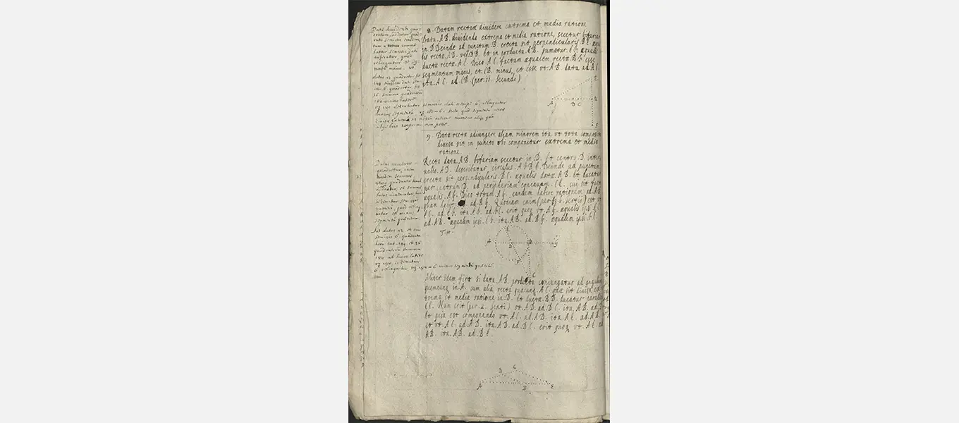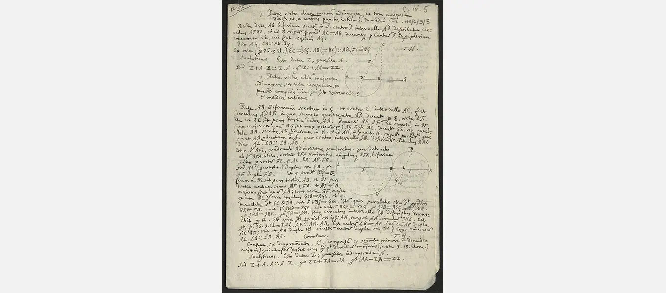 An example of this is the small collection of mathematical notes in the collection, which were once assumed to be in Hobbes’s autograph (like other items in the collection). However, it is now widely accepted that these papers are in fact the work of Robert Payne, mathematician and chaplain to the Earl of Newcastle, William Cavendish and his brother the scientist Charles Cavendish (the 3rd Earl of Devonshire’s cousins) in the 1630s. Payne served as a key figure in the intellectual and scientific circle around the Cavendish brothers which included other practitioners, such as William Oughtred, Walter Warner, John Pell, and of course Thomas Hobbes.