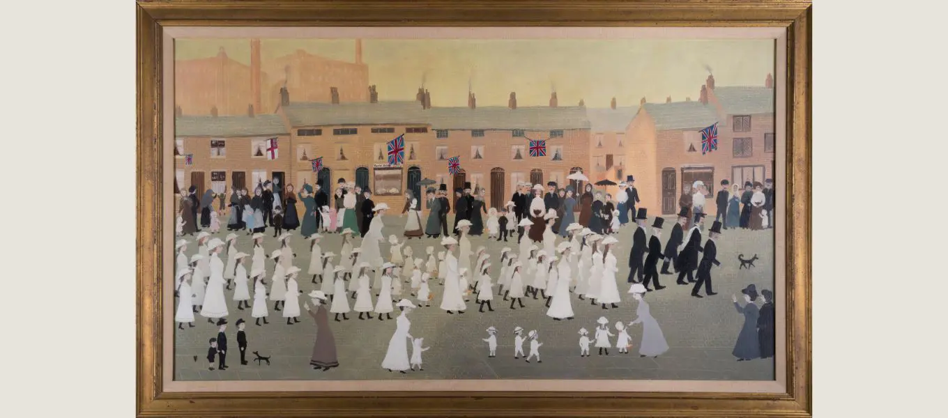 Photographs of children at Chatsworth – mainly amateur – taken between 1890 and 1930 featured in a flick-through photo album. The exhibition closed with The Whitsun Walk Through Lees (below), a painted memory of childhood made for her granddaughter by Helen Bradley, a prominent visual chronicler of Edwardian life and social history.