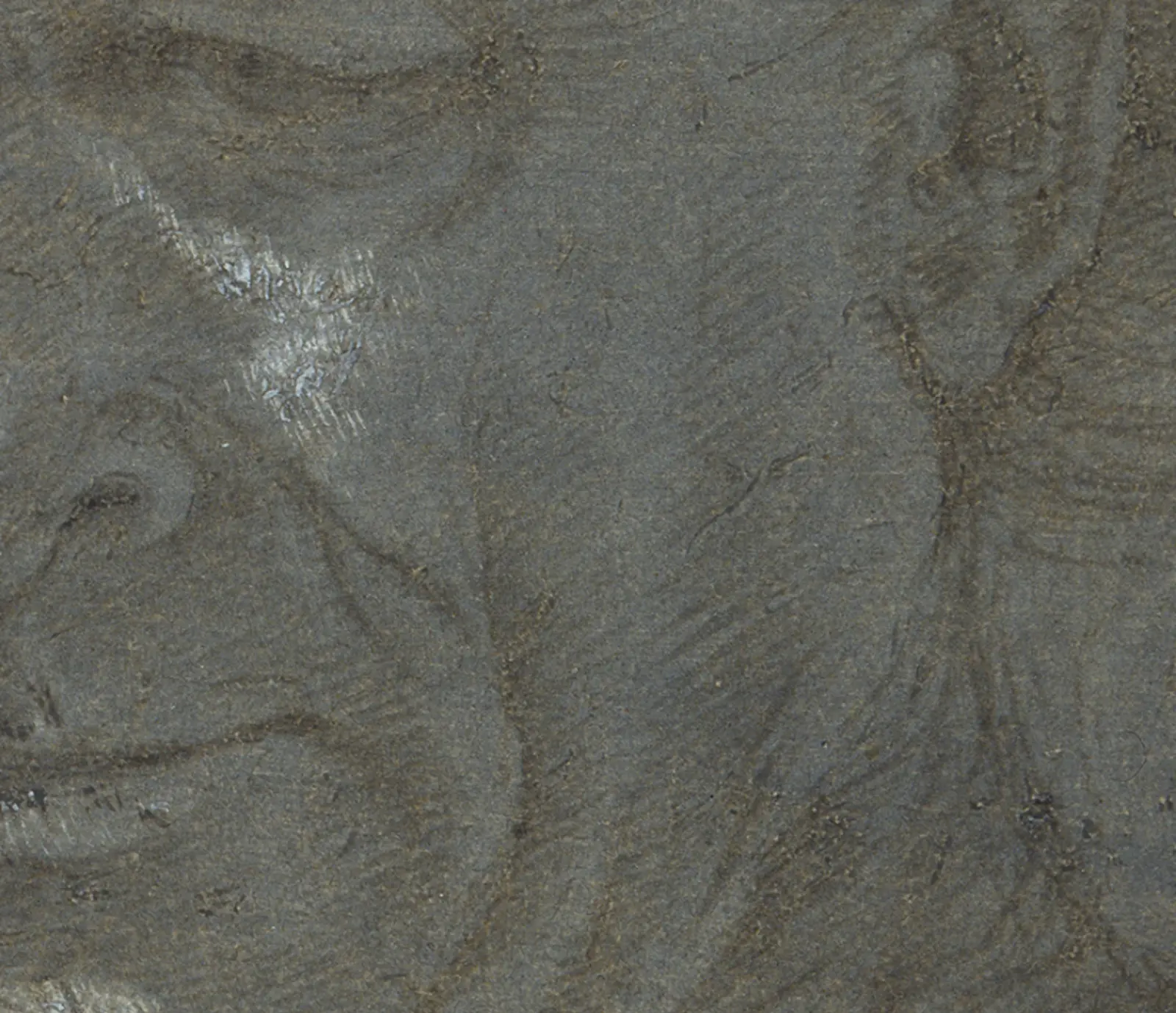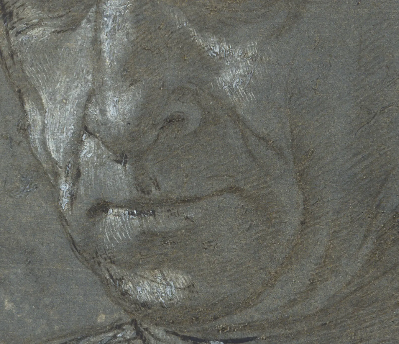 In these areas of the man’s face, the surface of the drawing has been heightened using white bodycolour (an opaque medium often applied to drawings on tinted paper and used to suggest contrasts). What effect does this have? Try to imagine what the drawing would look like without this bodycolour.