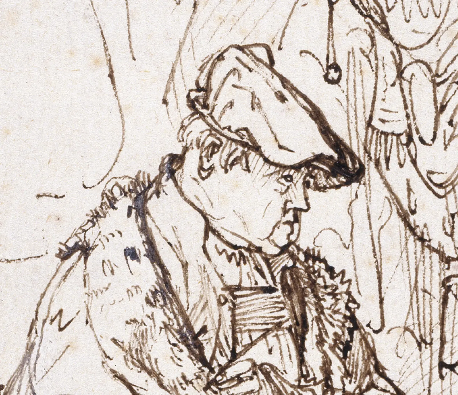 Rembrandt’s handling of pen and ink are electrifying. The assured parallel hatching of the actor’s right hand and across the fabric covering his right shin almost resemble the vital life signs of a cardiogram. The possibility of movement at any moment is rife. With the physical energy of flicking his wrist, Rembrandt has animated this flat surface.