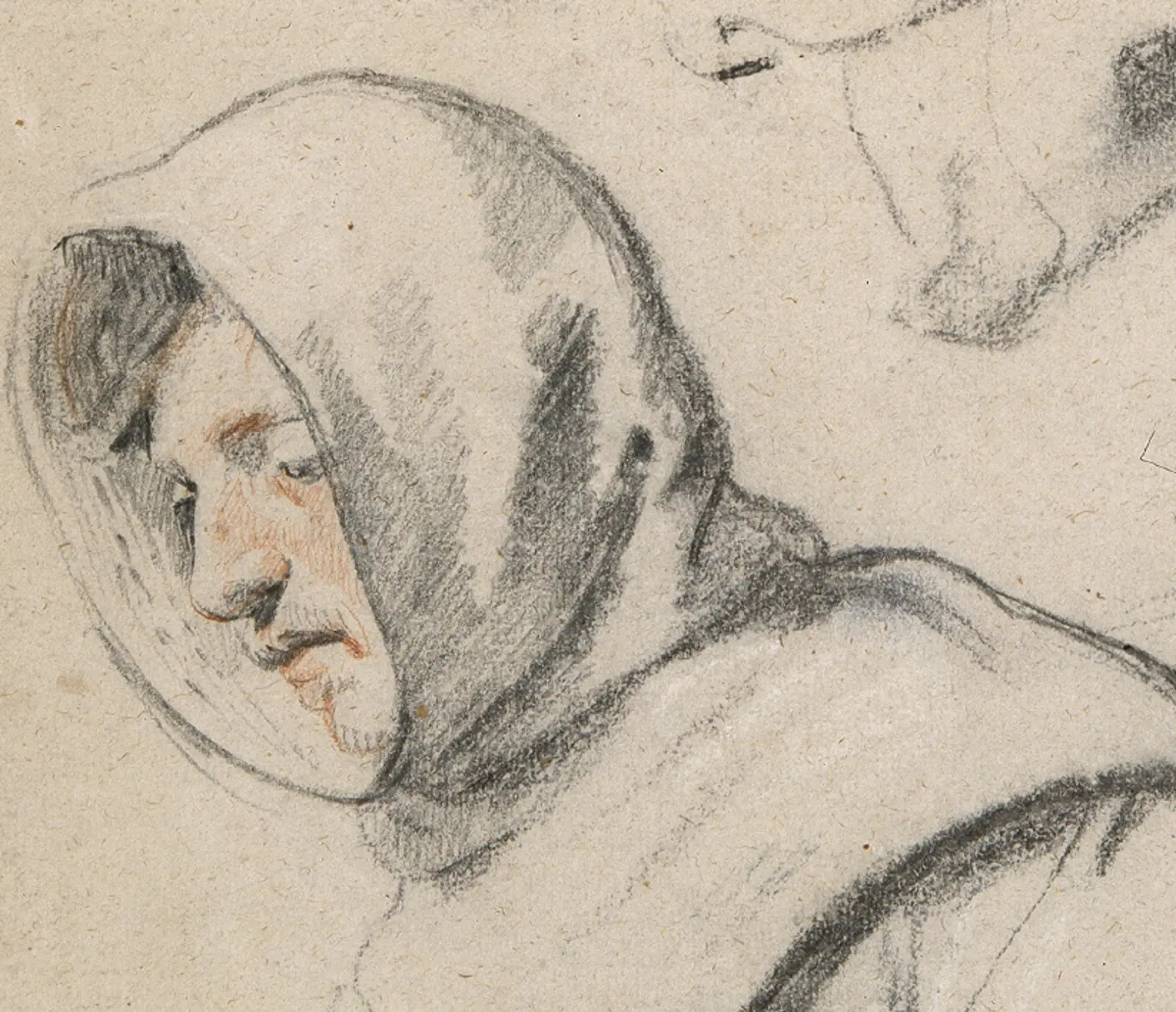 In this second detail, the ellipse of the hood frames the friar’s face. You can see that a swift sweep of the chalk suggests the ellipse. The black shading on the side and back of the hood also has a swiftness about it. Rubens concentrates his use of red chalk to the cheek, nose and chin of this friar. If you take a closer look, it’s also possible to see that some red chalk is visible in the friar’s hair. This might in fact suggest the earthy-brown colour of the Franciscan habit.