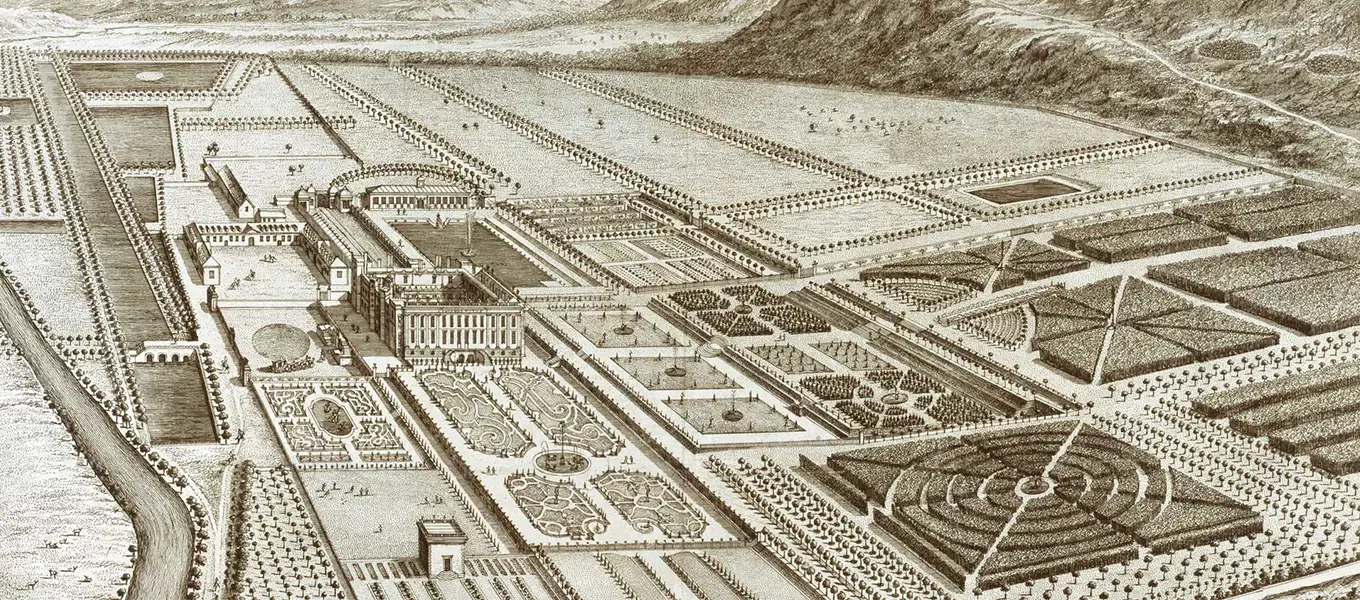 The south parterre began construction in 1694 under the guidance of George London and Henry Wise, who also worked at Hampton Court Palace. The parterre was a pattern of intricate flower beds, hedges and gravel paths.