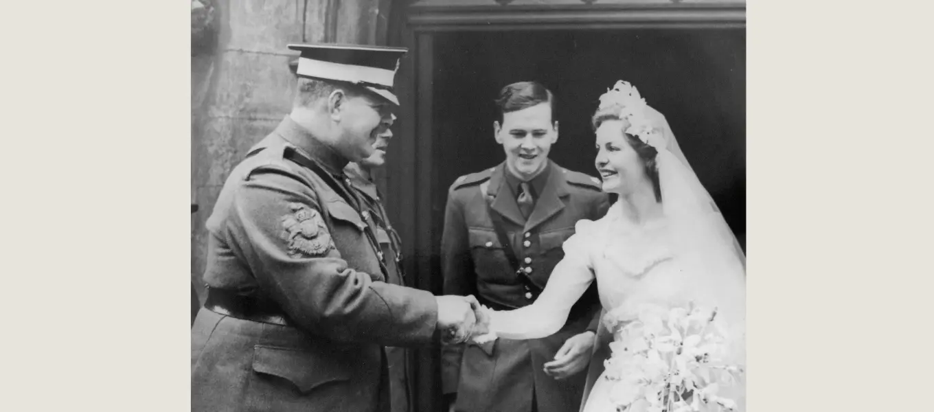 Youngest of the famous Mitford sisters, the Hon. Deborah Mitford married Lord Andrew Cavendish in 1941 in the bomb-damaged Priory Church of St Bartholomew-the-Great in Smithfield, London.