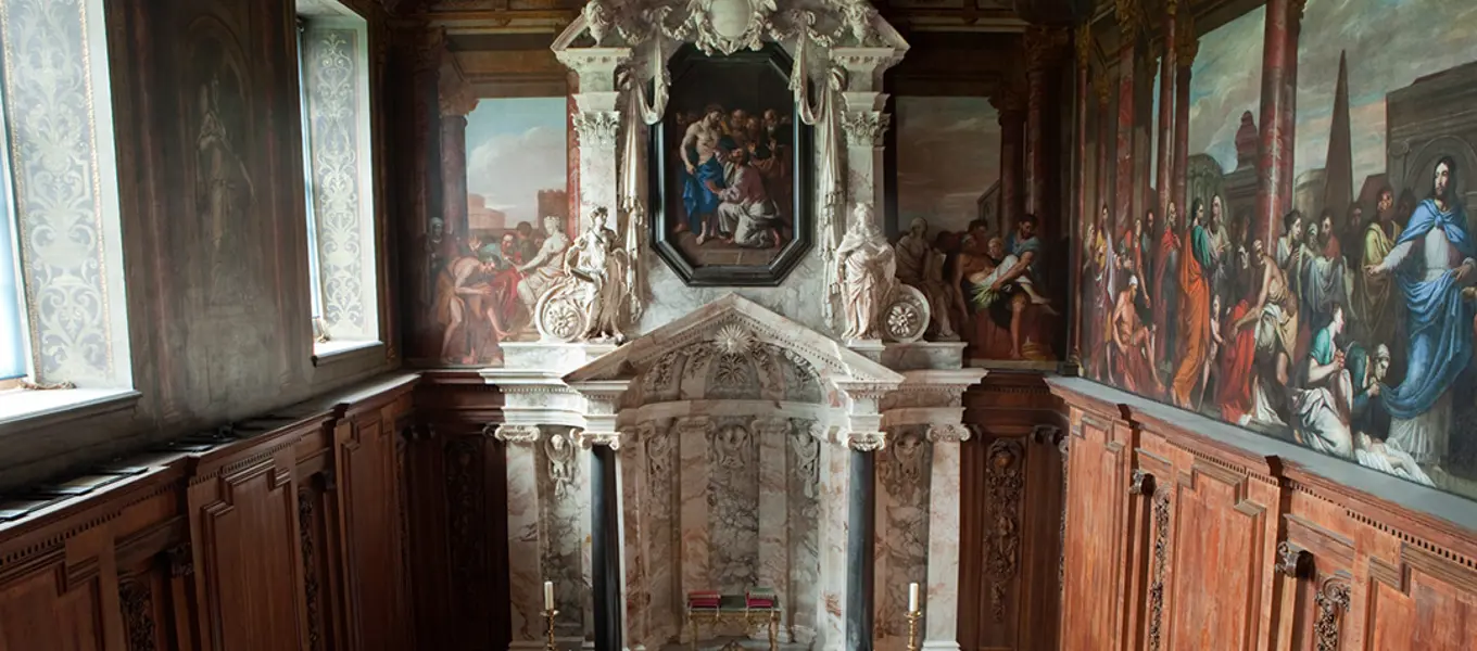 The principal scene on the wall opposite the windows presents Christ Healing the Sick, which is believed to be a reference to the restoration of the nation’s religious health by the removal of a Catholic King (James II) from the throne. The 1st Duke employed a Chaplain, and the household staff would have attended daily prayers, sitting in the body of the Chapel whilst the family would have been in the Gallery above.