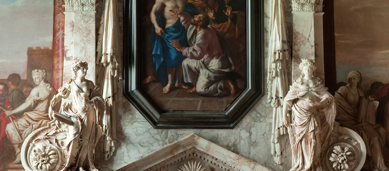 The focal point of the altarpiece is the oil painting of The Incredulity of St Thomas by Antonio Verrio (1639-1707). The painted decoration on the walls and ceiling is by Louis Laguerre and his assistant Ricard, both of whom had previously worked as Verrio’s assistants. The Royal Chapel at Windsor Castle, painted by Verrio a few years earlier, served as the inspiration for the painted decoration of the Chapel at Chatsworth.