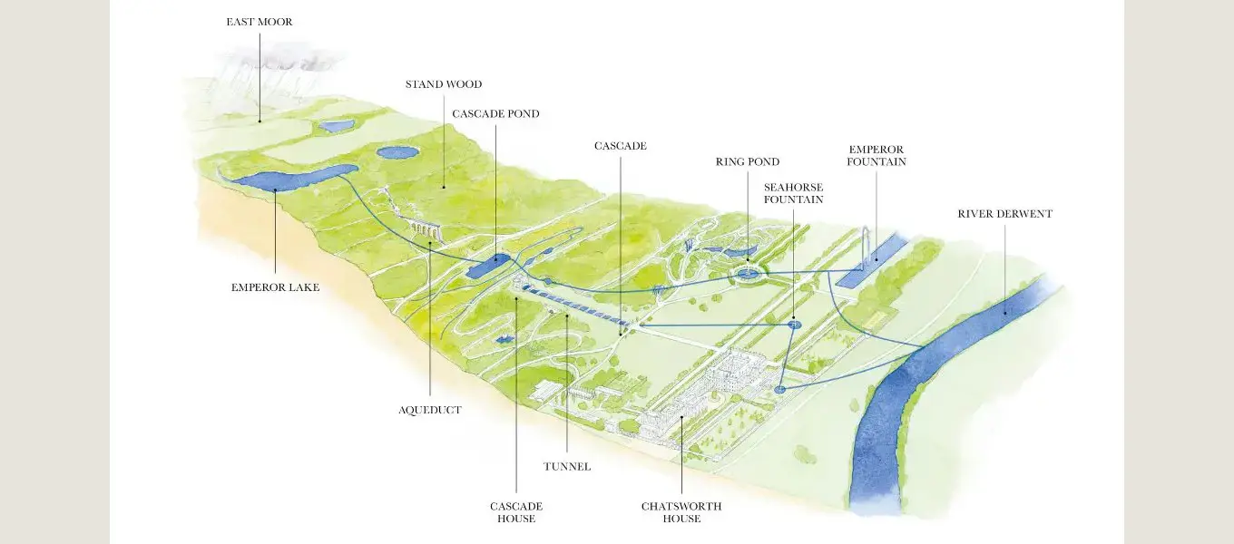 Extensive improvements and additions by the 1st Duke, in the late 17th century, and the 6th Duke, in the mid-19th century, needed to be fed by a reliable water supply. Man-made lakes were constructed on the hill behind the house from which an elaborate system of ponds, watercourses and pipes utilised gravity to direct the water where it was required.